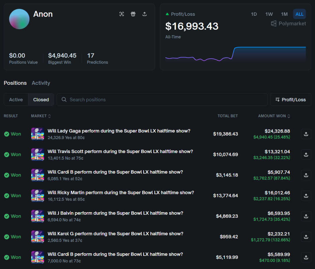 中场秀结束后,这 19 笔押注中有 17 笔命中,获利 1.76 万美元。一个新账户,重仓单一事件,命中率接近完美。这已经远远超出运气好的范畴。