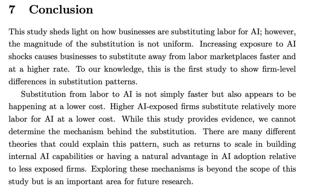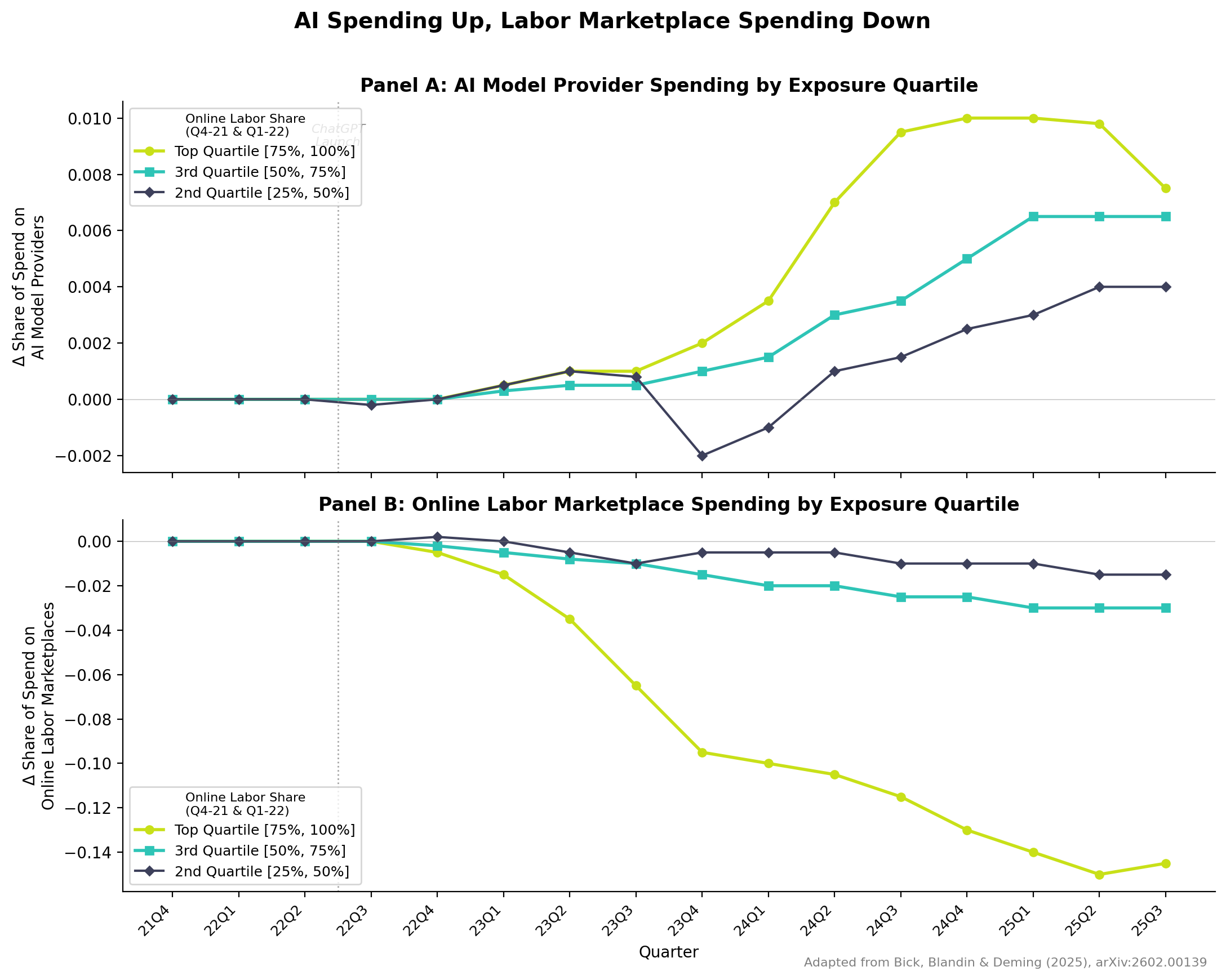 企业在 AI 模型供应商和在线劳动力平台上的支出占比变化量,按行业的 AI 暴露程度分组确有证据支持了 Citrini 的观点。Bick、BLAndin 与 DeMing 的一项基于企业支出数据的实证研究显示,在 ChatGPT 发布后,AI 暴露程度最高的企业(即此前在在线劳动力市场上支出占比最大的企业)显著增加了对 AI 模型提供商的支出,同时减少了在在线劳动力市场上的支出,降幅达到约 15%。值得注意的是,这种替代并非"等额置换"——企业每减少 1 美元的劳动力市场支出,仅增加了 0.03 至 0.30 美元的 AI 支出。换言之,AI 正在以远低于人工的成本完成同等工作量。