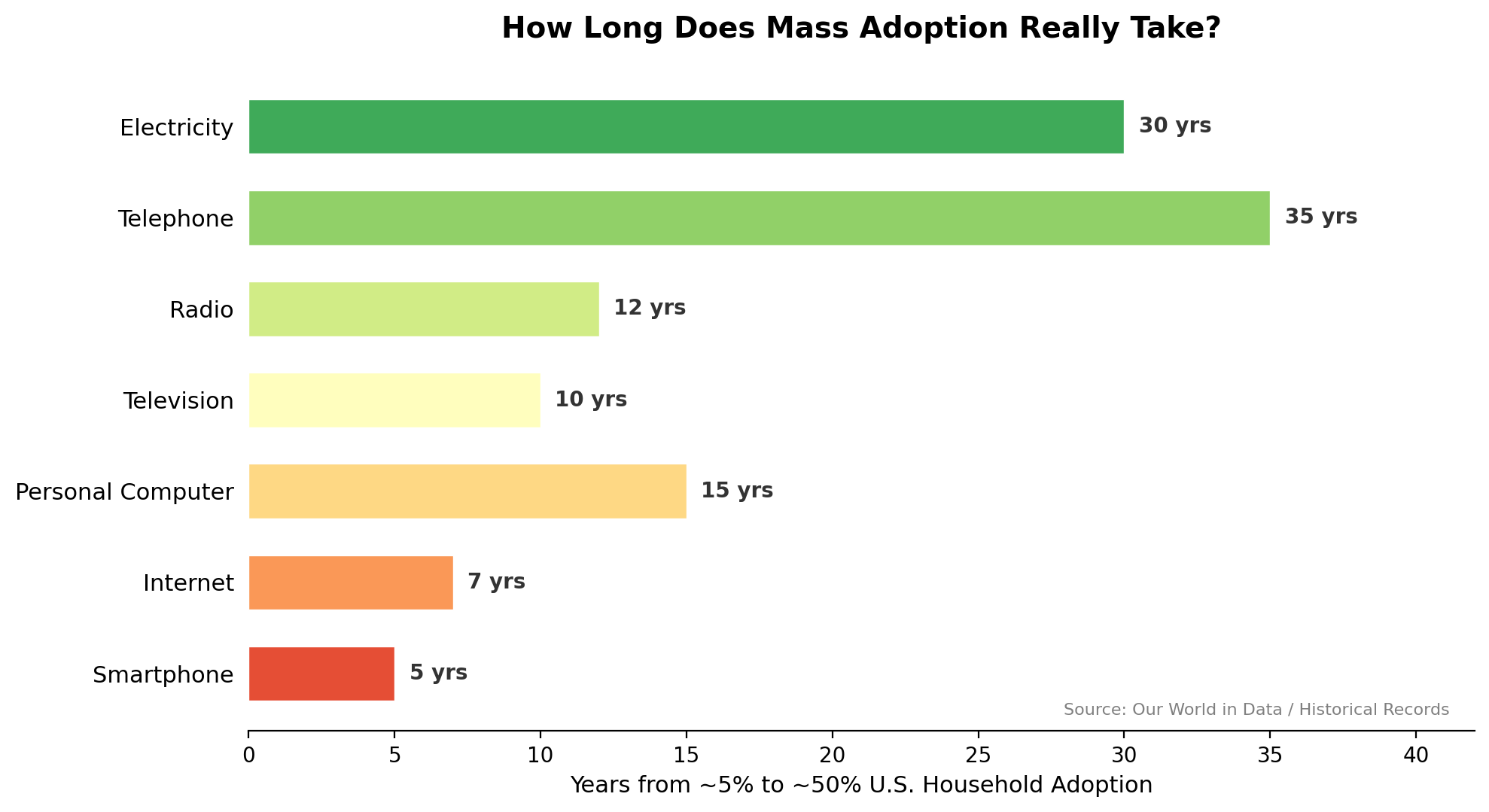 事实上,回顾历史上每一轮通用目的技术的扩散,从实验室到大规模渗透的过程总是比技术本身的成熟速度慢得多。电力花了 30 年才从 5% 的家庭普及率达到 50%,电话用了 35 年,即便是扩散速度最快的智能手机也需要 5 年。AI 的技术能力或许已经足以颠覆许多行业,但技术能力与制度吸收之间的鸿沟,从来都不是靠能力本身就能弥合的。