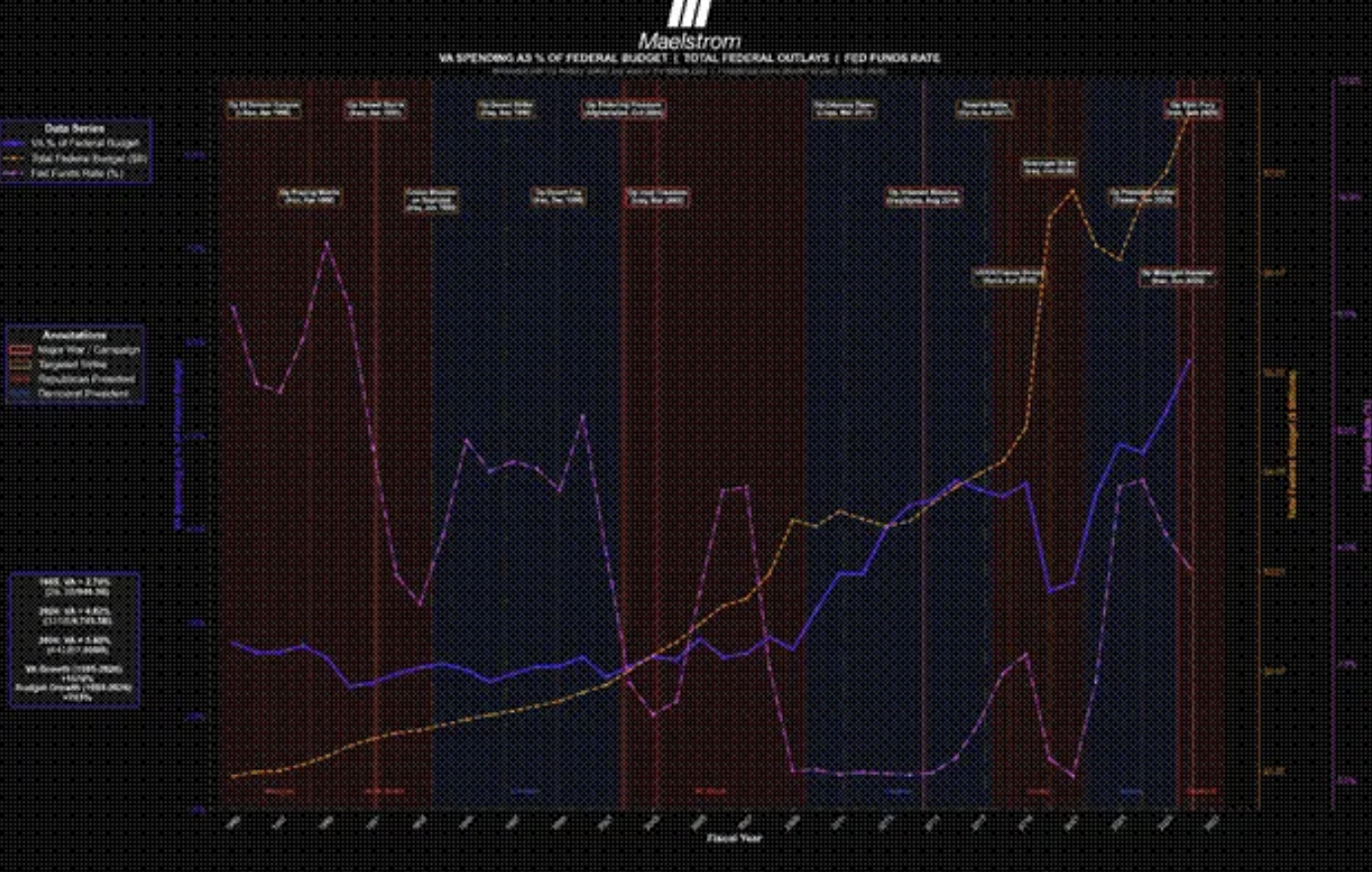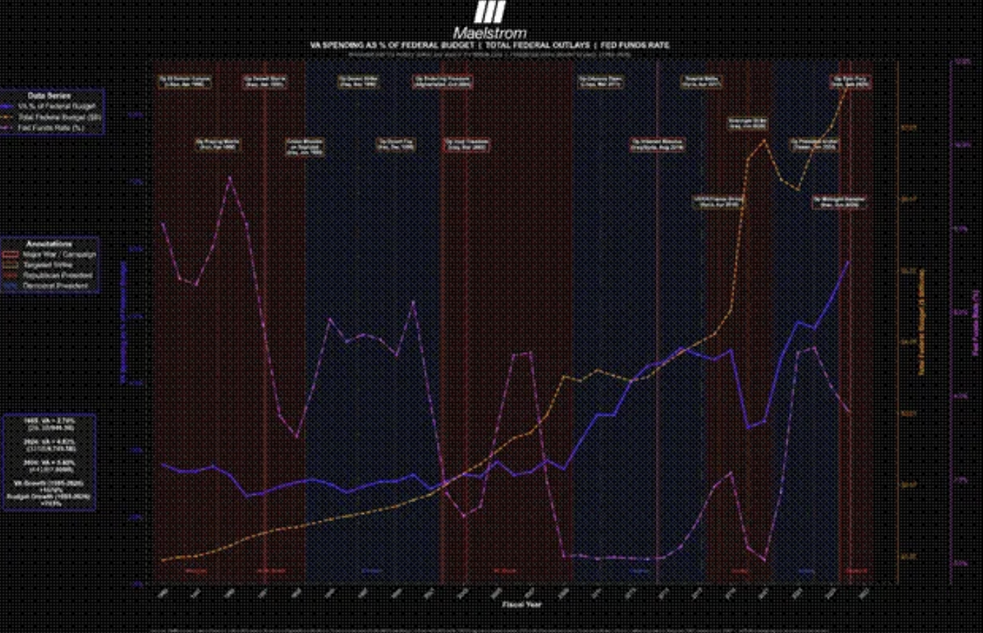 从宏观层面看,这张图试图呈现战争所带来的人类成本。图中以三个指标为核心:美国联邦预算中用于退伍军人事务部(VeTERAns AffAIRs,VA)的支出占比、联邦政府名义总支出规模,以及有效联邦基金利率(Fed Funds Rate)。同时,图表还标注了一系列具有代表性(但并不穷尽)的美国对中东国家发动的导弹打击或全面战争事件。